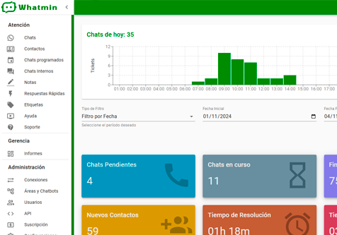 Respuestas rápidas prediseñadas, informes y estadísticas para optimizar la atención, con monitoreo de tiempo de respuesta, cantidad de chats y calificación de clientes.