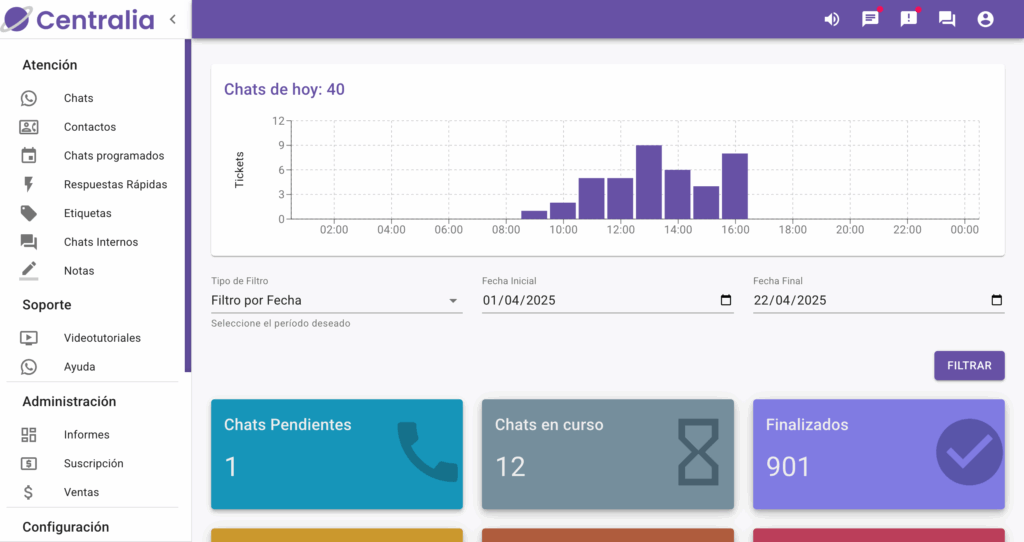Los agentes pueden gestionar tickets, etiquetar conversaciones y transferir chats cuando es necesario. Además, los recordatorios y mensajes programados aseguran un seguimiento cercano al cliente.